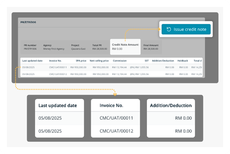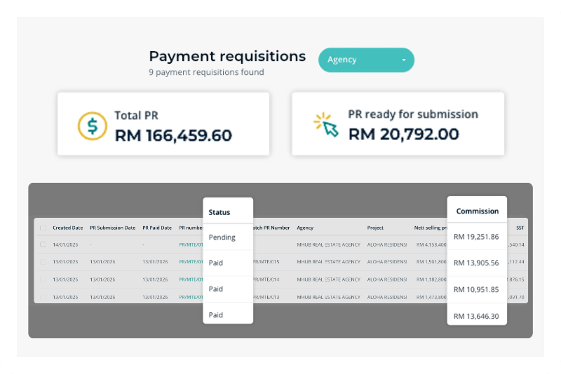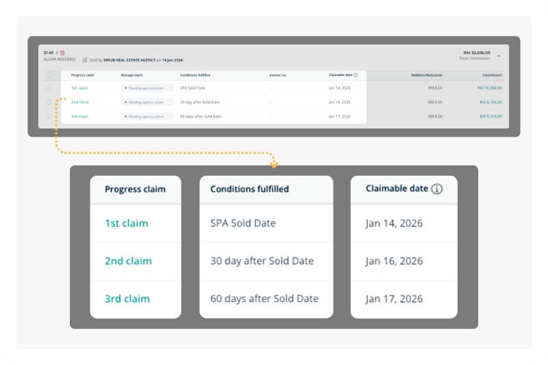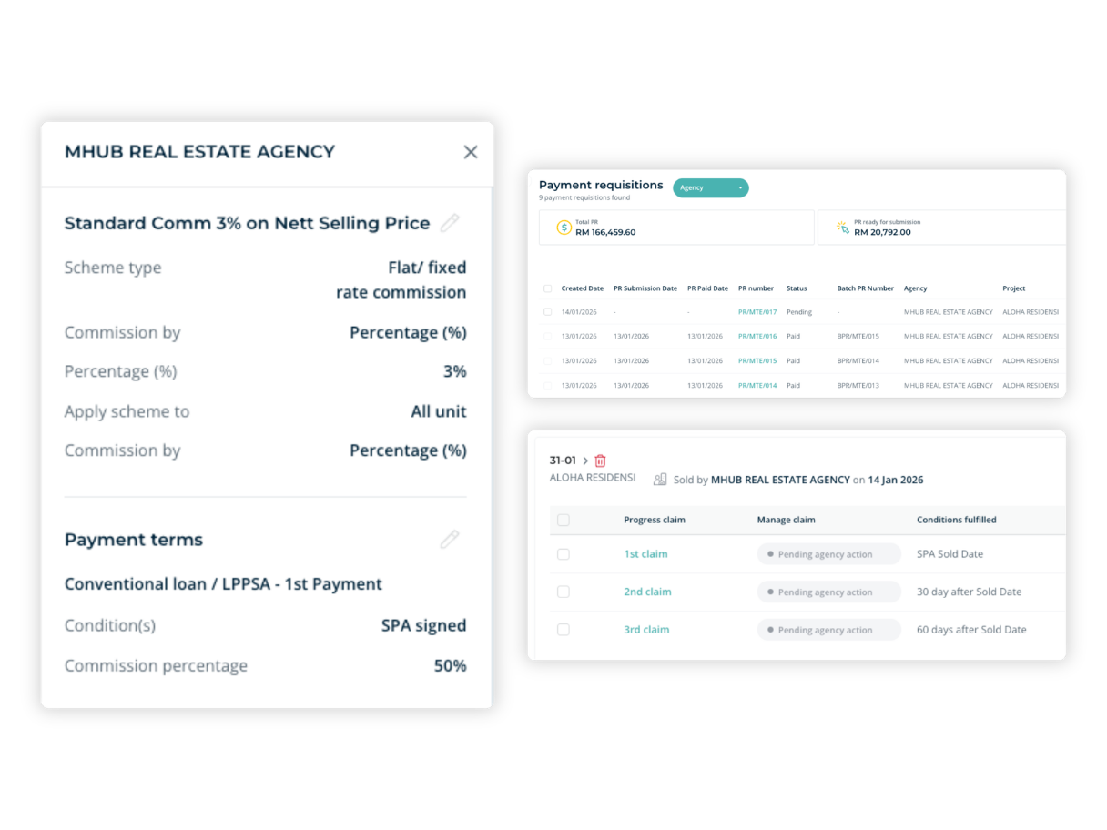 Define when commissions unlock: booking, SPA, loan approval, or VP14. Payments release only when sales confirms the milestone is achieved.