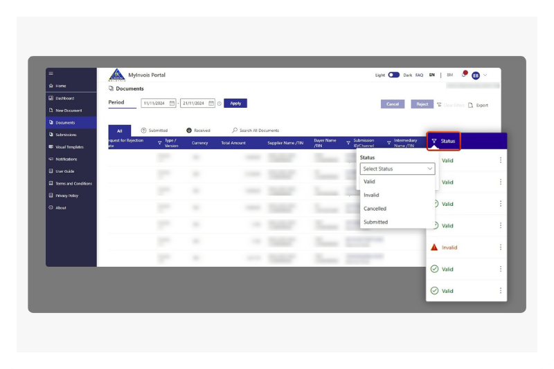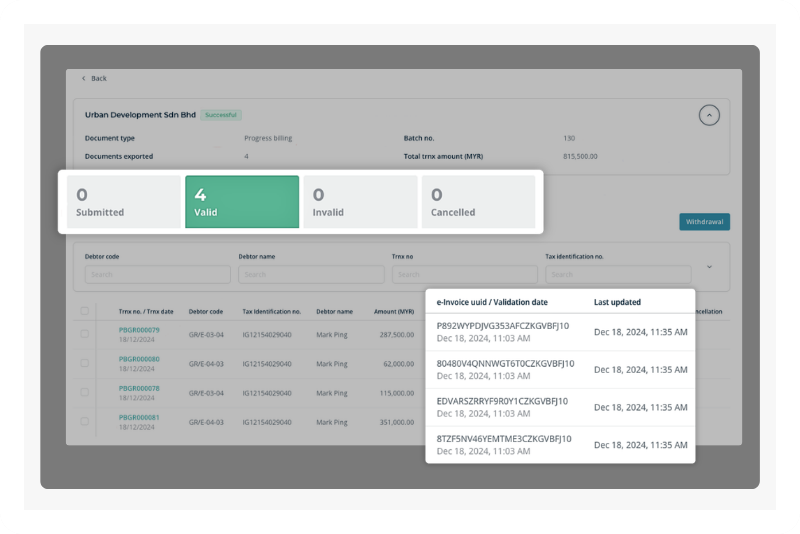 See which invoices passed LHDN validation, which are pending, which need attention.